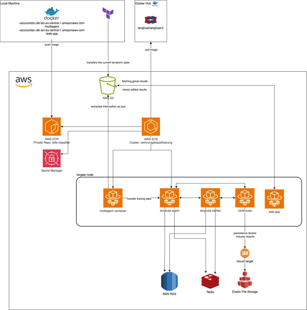 Wie in der oberen Abbildung zu erkennen ist, laufen fünf Container in derselben Laufzeitumgebung. Alleine drei existieren für das Observability-Tool Langfuse, auf das ich unten genauer eingehen werde. Da ich mich in dieser Reihe auf die Infrastruktur konzentriere, hier nur ein paar Worte zum Multiagenten-System: der Container multiagent container besitzt die KI-Logik. Durch LangGraph werden die verschiedenen Agents orchestriert und so die komplexe Dokumentenextraktion realisiert. Ein Agent kümmert sich um die Texterkennung, ein Agent um die Kategorisierung der Rechnungsposten etc. Außerdem sendet der Container Tracing-Daten an Langfuse. Im S3-Bucket landen die Resultate (JSONs) des Multiagents. Die Web-App greift sich die extrahierten Daten und stellt sie dann dem User in einer ansehnlichen UI zur Verfügung. Somit ist der GenAI-Workflow von der reinen Web-UI getrennt, was die Skalierbarkeit und Wartbarkeit während der Entwicklung vereinfachte.