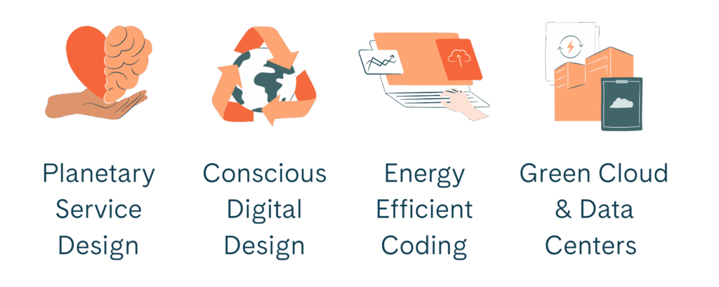 To support designers and developers in making conscious choices, we developed the Environmental Digitisation Toolkit. It translates broad sustainability goals into four tangible areas that digital professionals can directly influence: