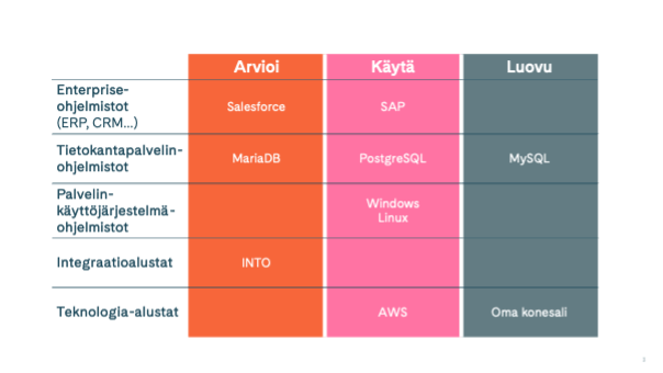 Samalla kun olennaisia teknologioita tunnistetaan, alkaa usein muotoutua käsitys myös siitä, minkälaisia kokonaisuuksia tai kategorioita ne muodostavat.Perinteisiä kategorioita ovat esimerkiksi tietokantapalvelinohjelmistot tai integraatioalustat, mutta myös tekoälyteknologiat alkavat näkyä teknologiavalinnoissa.