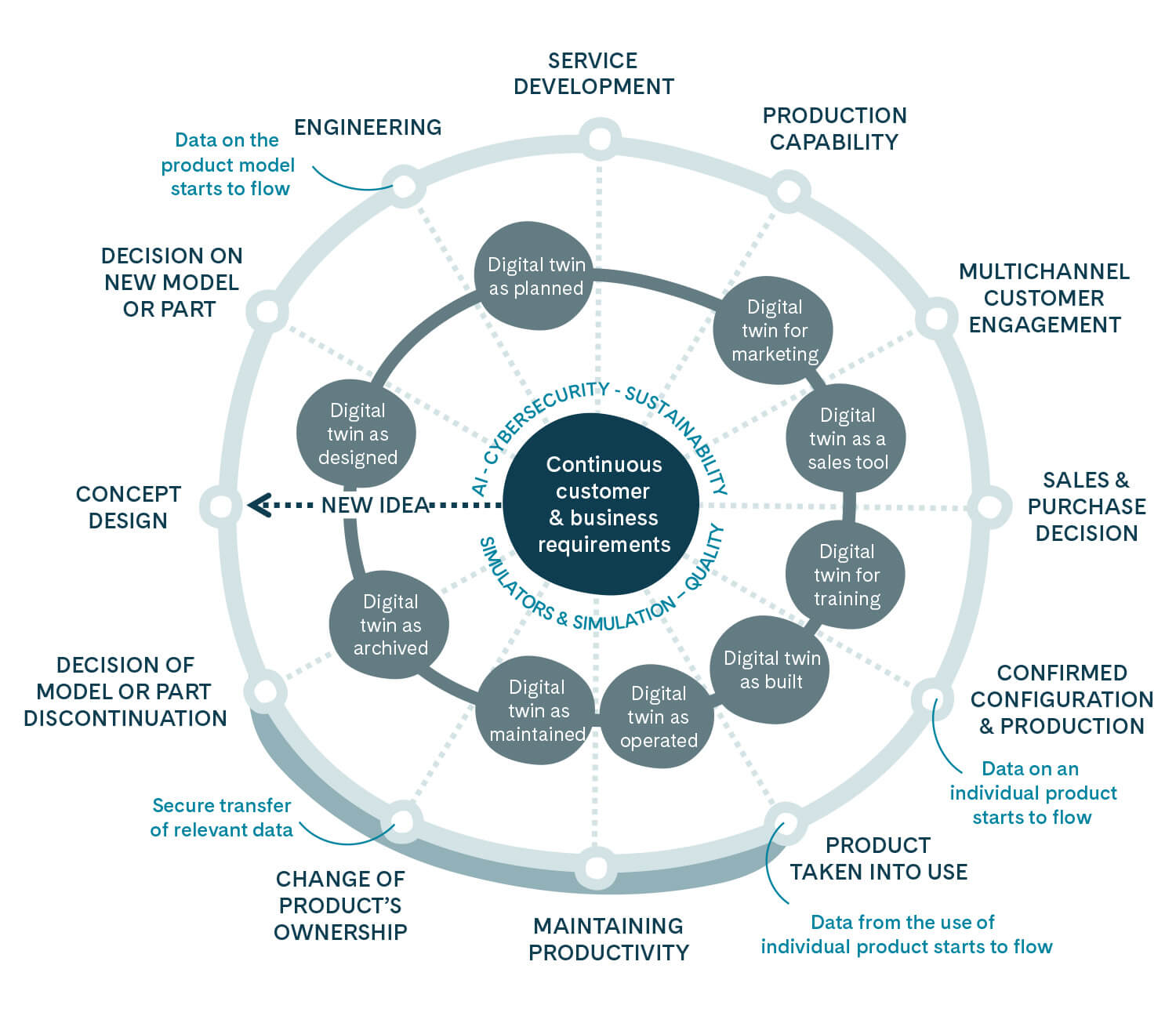 Digital Product Lifecycle -mallin avulla koneiden ja laitteiden elinkaaren aikainen data voidaan muuttaa jatkuvaksi liiketoiminta-arvoksi. Jokainen suunnitteluratkaisut, konfiguraatio, muutos ja huoltotoimenpide tallentuu osaksi yksilöllistä tuotetietoa. Kun laite siirtyy käyttöön, mukaan tulee myös reaaliaikainen käyttö-, suorituskyky- ja energiankulutusdata.